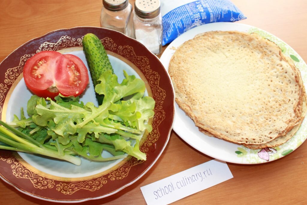 Блюдо получается нарядным и эффектным. Сочное сочетание сезонных овощей с миниатюрными рулетиками из тонких блинчиков свежо и необычно. Богатый витаминный состав делает кушанье полезным, а сметанная заправка – сытным. Рецепт прост и не требует особых навыков. Ингредиенты: Приготовление Овощи моем и просушиваем. Количество их произвольно и может варьироваться в зависимости от наполнения холодильника и предпочтений хозяйки. Листья салата оставляем целыми, если они небольшие. Крупные просто рвем руками. Помидор режем большими кусочками. Огурчик нарезаем брусочками. Зеленый лук измельчаем. В порционную тарелку выкладываем горку салатных листьев. Затем раскладываем помидоры, огурцы, рассыпаем зеленый лук. Набор овощей может быть произвольным и зависит от вкусов в семье и ассортимента холодильника. Здесь интересна сама идея компоновки овощей с блинами и сметанным соусом. Все солим, приправляем специями и поливаем сметаной. Красиво смотрится кушанье с хаотичными штрихами из соуса. Используем