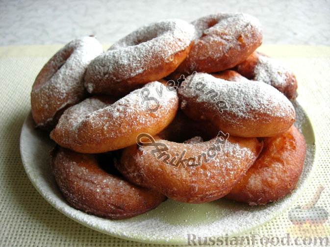 Оставляем дрожжевое тесто в теплом месте на 1,5 часа, чтобы оно увеличилось в объеме в 2 раза. Хорошо разогреваем растительное масло для жарки пончиков. Тесто выкладываем в специальную ложку, предварительно разогретую в масле. Опускаем ложку с тестом в раскаленное масло