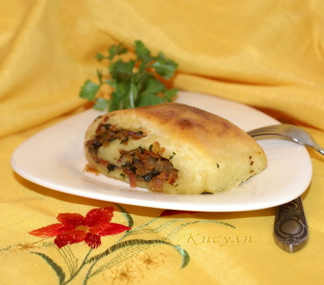 Ингредиенты: Картофель натереть на мелкой тёрке. Для удобства предлагается тереть немного недоваренный картофель, а тёрку смазать растительным маслом. Муку смешать с крахмалом, всыпать к картофелю. Добавить яйца взбитые с солью и растопленным маслом, сметану. Замесить тесто, не слишком крутое. Оставить полежать 30 мин. Мелко нарезать лук. Измельчённую грудинку или бекон вытопить до состояния шкварок. На полученном жиру пассеровать лук. Добавить измельчённую зелень петрушки, пассеровать - начинка готова. Тесто раскатать в пласт толщиной 1,5 см, выложить начинку, свернуть рулетом. Край рулета склеить желтком. Рулет нарезать кусками 5-6 см. Выложить в жаропрочную форму и запечь при 200* 30-40 мин., иногда поливая молоком. Можно обжарить рулеты с двух сторон на сковороде. Подавать со сметаной и овощным салатом. Приятного аппетита!