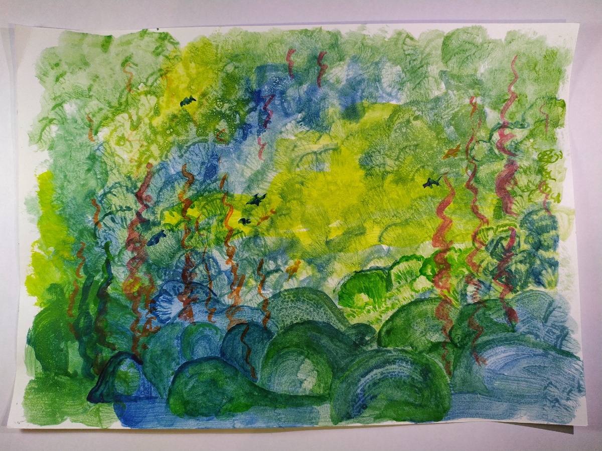 Вот смотрю на последнюю работу в простой технике акварель и диву даюсь. Делала не раз, не два. Тема знакомая - «морские глубины». Цвета те же (более трех не рекомендуется брать)- зеленый, синий, желтый. В исполнении все легко – мыло+акварель и мазки кистью в непроизвольном направлении. Дальше прорисовка деталей. Слишком много взяла краски на кисть, поэтому фон получился плотным, работа получилась темной, в некоторых местах даже грязно. Буду дальше экспериментировать, пробовать, тренироваться. В следующий раз попробую мыльные пузыри…