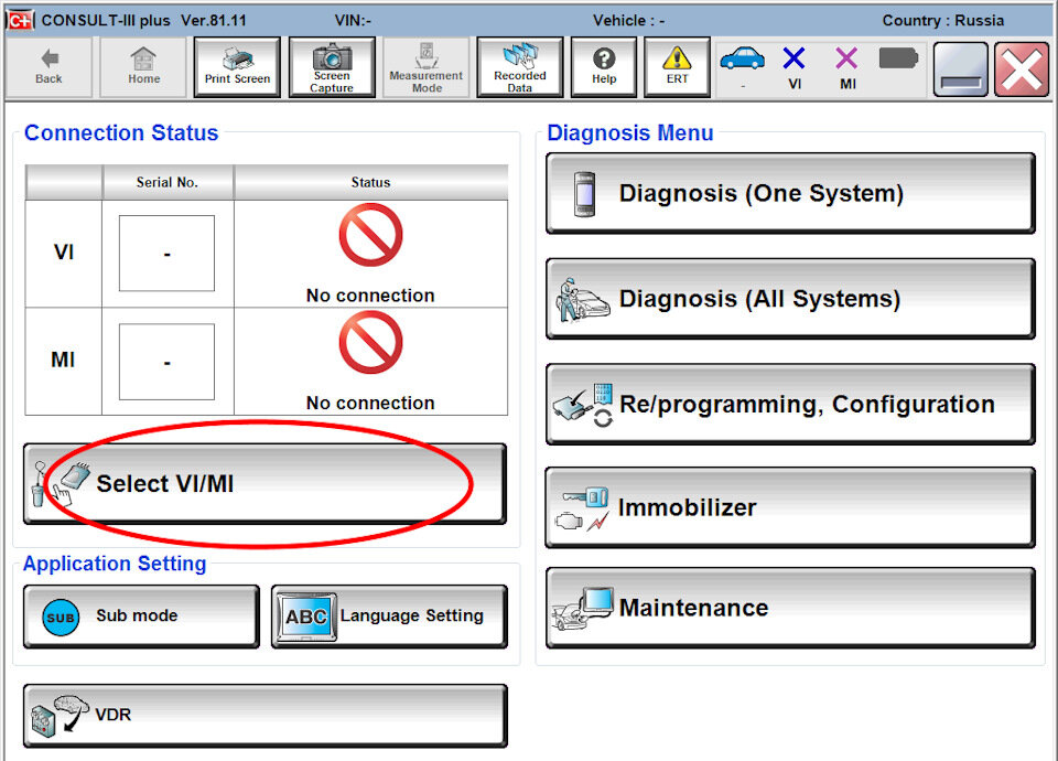 👉В интернете нашел, что дилерский Consult 3 может работать с практически любым J2534 кабелем, правда с ограниченным функционалом, но читать все блоки, выполнять сервисные функции и вроде даже вносить изменения в конфигурацию блоков он может, а мне большего и не надо. Далее понадобится ноутбук, само ПО Nissan Consult 3+, которое можно найти на торрентах и прибор для активации датчиков, сейчас найти его не проблема, он должен быть в каких-нибудь шиномонтажах или магазинах, где продают эти самые датчики и резину, на крайний случай можно купить его с али, ищется он по запросу TPMS активатор и стоит самый дешевый порядка 5-10$. 👉Описывать установку и настройку консалта я не буду, это уже много раз написали до меня и легко ищется в интернете, но если будут какие-то вопросы — пишите, отвечу. 👉После того, как все настроили, запускаем консалт и видим главное меню, в котором нажимаем Select VI/MI: Откроется окно, в котором сразу жмем Close: После чего в Connection Status должно появиться ак