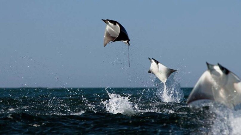 Эти скаты вырастают до огромных размеров, и они летают словно птицы над толщей воды в океане. Конечно такое зрелище встречается очень редко, так как популяция этих красивых и огромных скатов очень быстро сокращается. Однако некоторым людям все же удавалось наблюдать как огромные скаты выпрыгивали и пролетали на толщей воды и вновь погружались в неё.