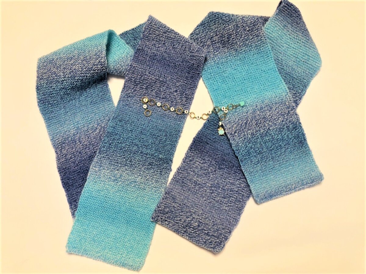 Схема вязания очень простая. Берем две спицы 3 мм, набираем на них 34 петли + 2 петли для кромочных. Вынимаем одну спицу и вяжем платочной вязкой до нужной длины.