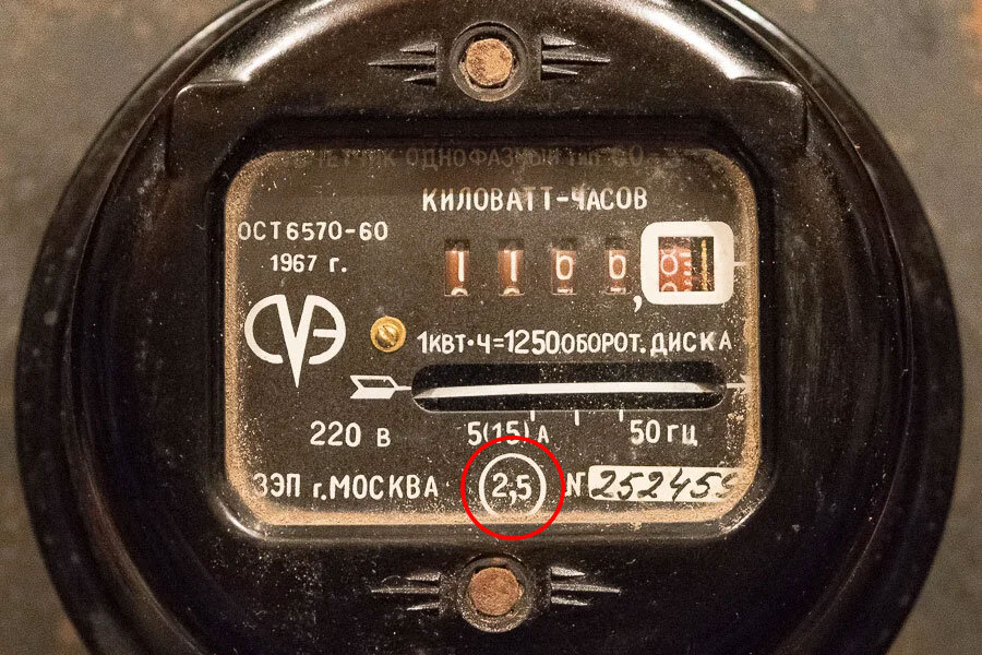 В кружке у счётчиков бытовых потребителей могут быть также цифры 2 и 1. Замечу, что счётчики бытовых потребителей с классом точности 2,5 и менее точные подлежат замене (ПП от 4 мая 2012 г., п.138) после истечения установленного срока их эксплуатации (п.142). Как правило, срок эксплуатации индукционных счётчиков — 32 года.