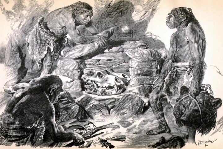 Особый интерес для изучения первых проявлений язычества представляют знаменитые мустьерские "медвежьи пещеры", в которых медвежьи кости составляют 95-99% всех костных останков, а количество особей доходит до 800-1000 медведей в одном пункте. В 1917-1923 годах палеонтологи Эмиль Бахлер и Нигг обследовали высокогорную пещеру в восточной части Швейцарских Альп, которую местные жители, обитатели кантона Сент Галлен, называли Драконовой (Drachenloch). Расположенная на высоте 2500 метров над уровнем моря и на 1400 метров над ложем долины речки Тамина, впадающей в Верхний Рейн, пещера эта почти никогда не посещалась и потому в ней сохранились неповрежденными интереснейшие следы неандертальской культуры. Около ста тысяч лет назад, в холодную ледниковую эпоху люди посещали Драхенлох значительно чаще, чем теперь. Первому залу они предпочитали второй, куда почти не проникали лучи солнца и пронизывающие ветры с горных вершин. В самом месте перехода из первого зала во второй археологи натк