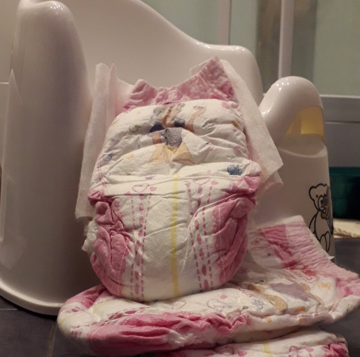 Я забросила это занятие до того, как дочке не настало 2 года. Тут вздохи и охи стали более активными. Мне все более настойчиво приводили примеры, кто-то вздыхал, что, о, ужас, лето впереди, а девочка будет ходить в подгузах! И они, о ужас, будут заметны из под платьев! Да, это я сейчас понимаю, что все "о ужас ребенок не делает/делает то-то" это комплексы родителей и не более того. И короткие легинсы под платья идеальная вещь, чтобы не было понятно, что надето у ребенка. Но, тогда я занервничала и начала очередную попытку: я постоянно терла паркет от того, что дочь, посидев на горшке и встав через 5 минут, делала это на пол. Я стирала ее одежду, потому что голышом сидеть на полу было уж слишком, и постоянно носила мыть дочь, потому что даже в 2 года ей было прикольно пошлепать руками в том, что из нее вытекло.