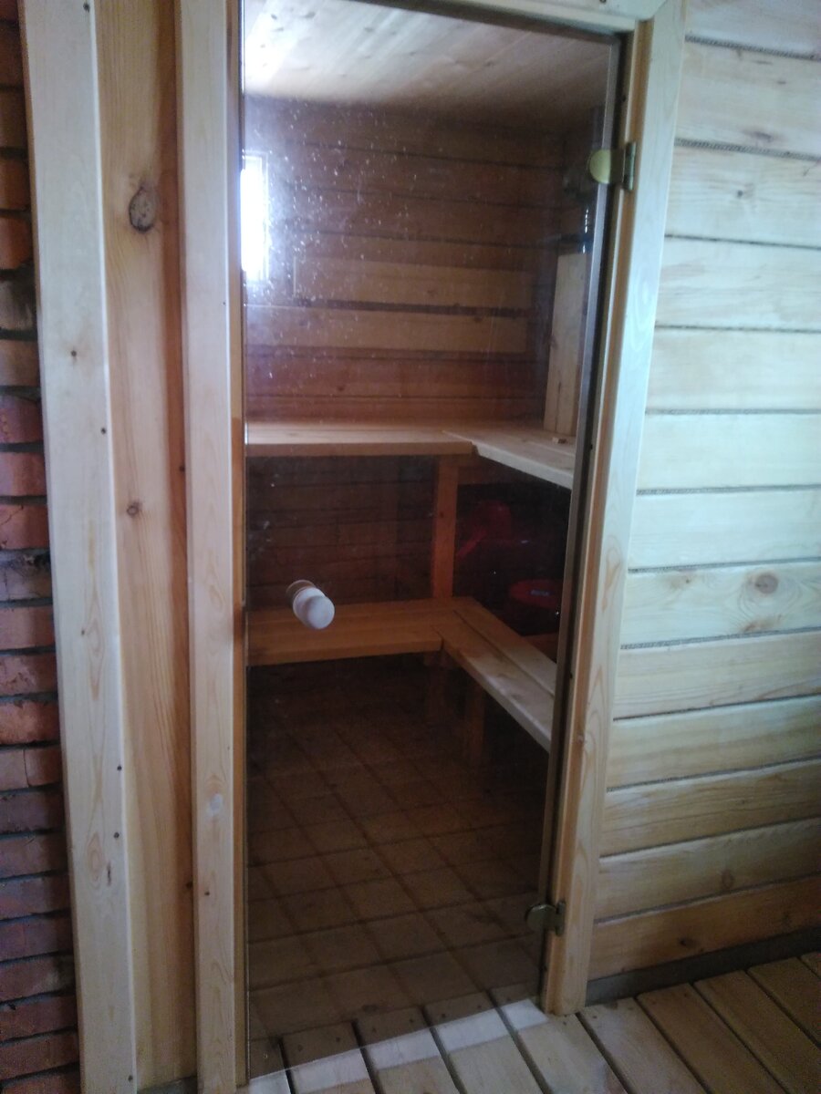 Сразу напишу про её единственный МИНУС!!!!На ней видны высохшие капли))))))) теперь о плюсах!!!Эту стеклянную дверь лучше ставить в парильном помещении.Через неё всё видно,ну на тот случай если кому станет плохо,как говорится перекайфует(инциденты кстати были) Ещё эту дверь не поведёт,она не сгниёт,а смотрится просто шикарно. Цена у этой двери не большая,также стоит как и матовая в мойке,4500т.р. Про матовую дверь я описал в предыдущей статье!!! Регулируется простым шестигранником. Открывается на всю ширину,то есть аж упирается ручкой в стену(так хорошо сделаны навесы) Смотрятся навесы обыкновенно,сверху вы видите декоративные накладки Навесы прикручены к дверной коробке(идёт в комплекте) Ручка состоит из двух обыкновенных шаров,скрученных между собой на шпильку.Дверную коробку сейчас закрывают декоративные обналичники,поётому её не видно Из какого дерева,я не знаю но не нагревается точно(это я про ручку) Толщина стеклянной двери 6 миллиметров.Этой толщины предостаточно.Вот для сравнен