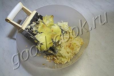 Натирать нужно начинать с плоскости разреза, тогда в конце натирания шкурка останется в руке, а мякоть пройдёт сквозь тёрку. В сковороду налить растительное масло и выложить натёртые яблоки. Поставить сковороду на средний огонь.