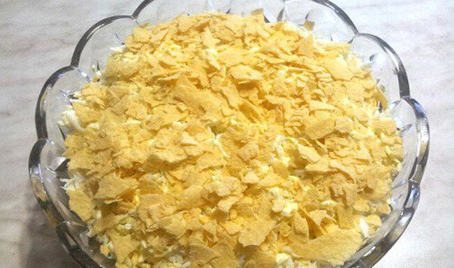 Предлагаем вашему вниманию классический рецепт красивого многоярусного салата "Парус", необычный, пикантный, но не острый вкус которого понравится даже самым взыскательным гурманам. Время готовки: 30 минут Количество порций: 6 Ингредиенты: Приготовление: 1. Нарежьте курицу соломкой или кубиками, выложите на дно неглубокого салатника и смажьте майонезом. 2. Порежьте корейскую морковку, положите вторым слоем и снова промажьте майонезом. 3. Выложите кукурузу. 4. Поверх кукурузы положите тертые на крупной терке яйца, покройте майонезом и хорошо распределите его по поверхности последнего слоя. 5. Оставьте салат в прохладном месте на 1,5 - 2 часа для пропитки. 6. Перед подачей на стол украсьте блюдо крошками чипсов. Часть чипсов вставьте перпендикулярно. 7. Несколько листочков зелени (петрушки, укропа, кинзы или др.) уложите по бокам для декора. Салат можно разнообразить заменой некоторых компонентов. Например, вместо куриного филе можно взять индейку, кукурузу заменить зеленым горошком, а