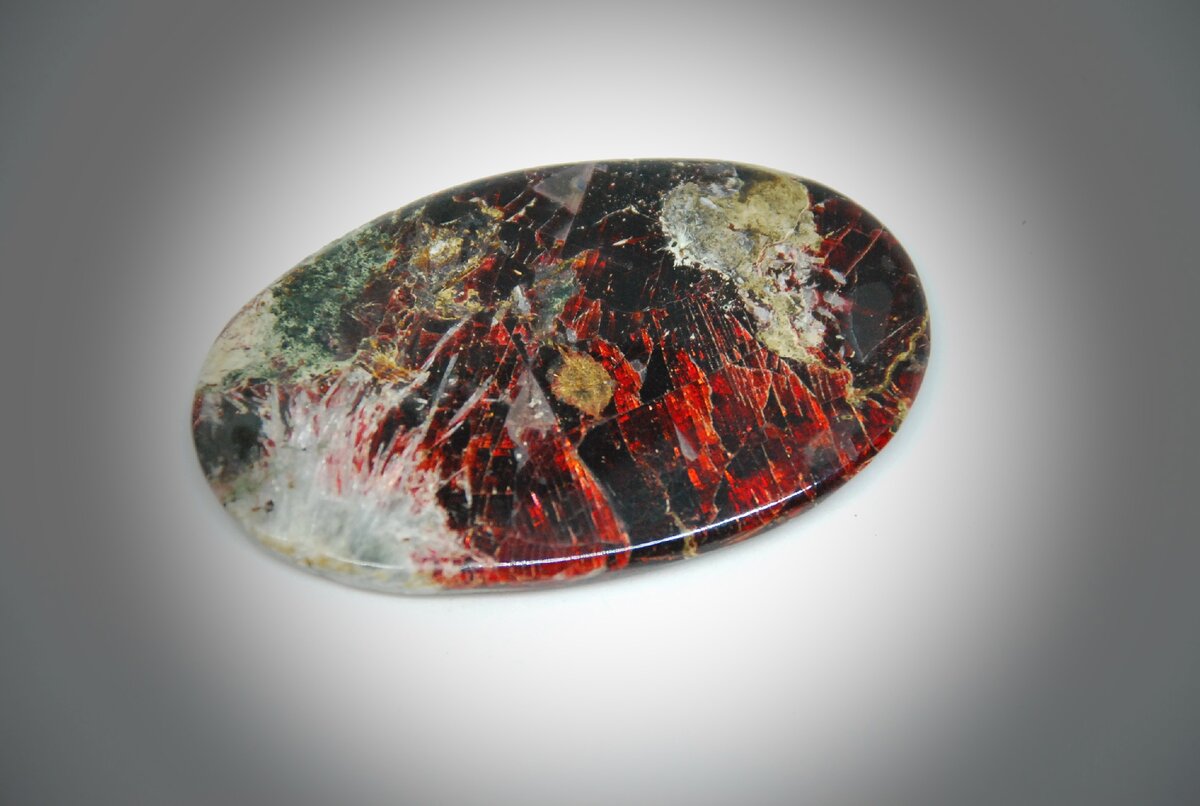 Этот, очень редкий минерал, образуется глубоко под землей. Его красота завораживает - он весь словно наполнен живым огнем. Стоит повернуть камень в руке, и по всей поверхности пробегают алые всполохи.