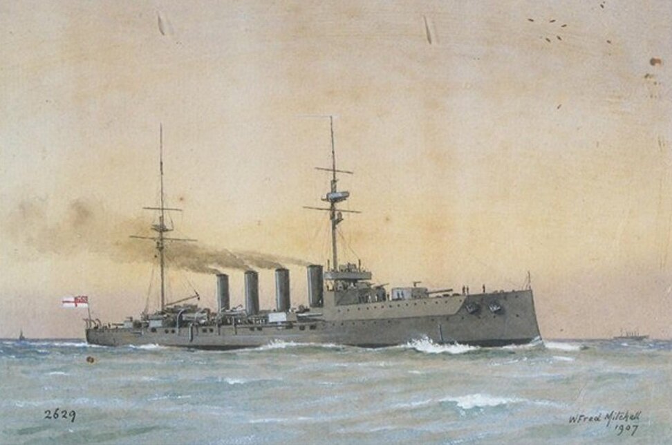 10.08.1914 вместе с “Duke of Edinburgh” направлен в Красное море для защиты войсковых конвоев, прибывающих из Индии. Захватил германские лайнеры “Sudmark” и “Istria”. В ноябре 1914 г. базировался на Гибралтар.