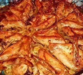 кг крылышек + соль, перец по вкусу + приправа для курицы+ 1ст.ложка (без горки) аджики+ 100гр майонеза + половинка среднего лимона(выдавить сок)+ 2 средние луковицы (нарезать кольцами) + 1небольшая головка чеснока (нарезать пластинками) + 0,5 литра минеральной воды с газом, все хорошо перемешать (попробовать маринад и если чего то не хватает добавьте по своему вкусу) и оставить на 2 часа. Затем в форму для запекания налить 2 ст.л растительного масла, на масло выложить замаринованный лук , поверх лука выложить крылышки и запечь в духовке при 200 градусах 1 час.
