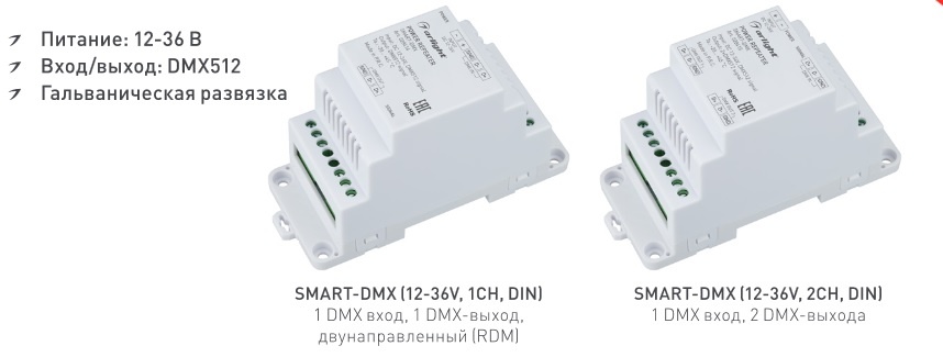 Усилители DMX – сигнала в SMART освещении. Усилители используются для расширения DMX-системы при подключении дополнительных новых устройств или при увеличении расстояния передачи сигнала по DMX-шине. Ознакомимся с новыми моделями, проводным и беспроводным усилителем. Проводной усилитель SMART-DMX. Усилитель по напряжению 12-36 В. Способ установки на DIN-рейку в щите управления освещением. Модель усилителя одноканальная способна передавать сигналы в обе стороны, что дает возможность эффективно работать в DMX-системах с RDM. Двухканальный усилитель применяют в случаях, когда разветвляют DMX-шину. За счет гальванических развязок, которыми оснащены разъемы устройств, дает устойчивость к помехам, что повышает надежность работы DMX-системы. Схема подключения: Беспроводный усилитель SMART-DMX. Усилитель используют для передачи DMX–сигнала на расстояние до 400 метров. Для данной работы устройства использ