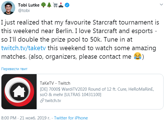 "Я только что узнал, что в эти выходные недалеко от Берлина проходит мой любимый турнир по старкрафку. Я люблю старкрафт и люблю киберспорт, а поэтому удвою призовой фонд турнира и доведу его до 50 тысяч".