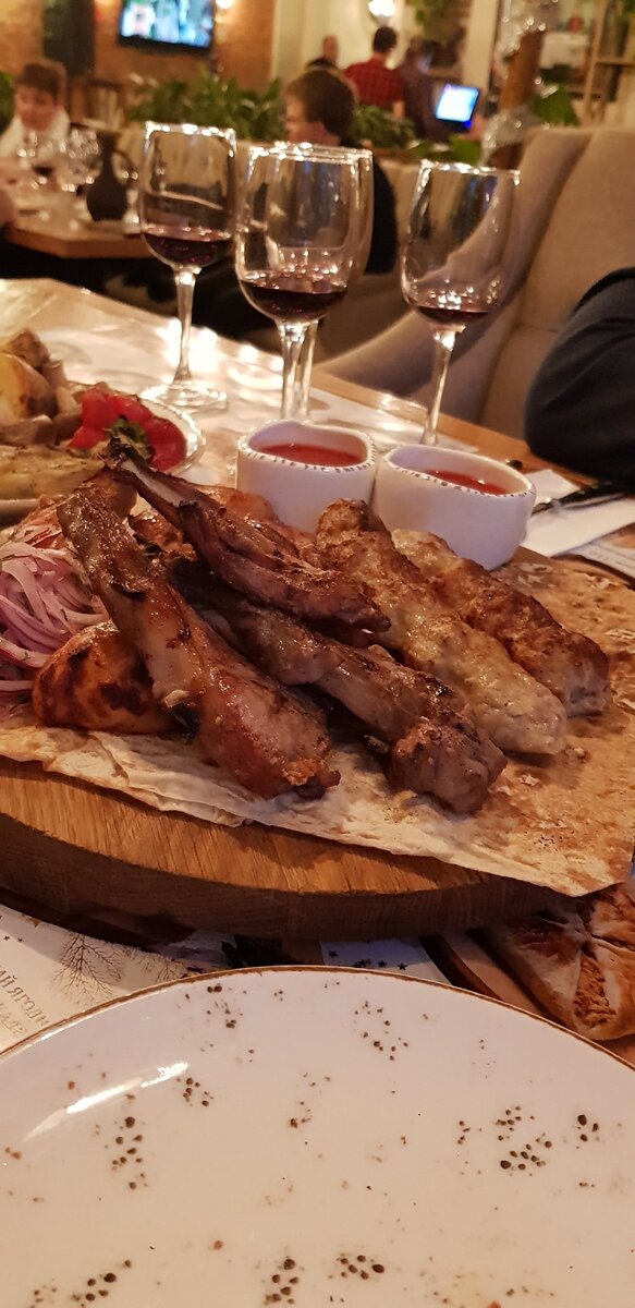Я не Зожник и не пп-шкин . И иногда мне хочется мясца, конечно же не свининку. Дачки тоже не имеем , а в лес не ходок,клещей боюсь 😂 ,поэтому ай-да за шашлычками. Выбор конечно в Москве громадный. Чайхана у нас помойму в каждом районе. Конечно же есть и сто вариантов стейковых от $ до $$$. Вобщем многое, что пробовали, но делюсь двумя вариантами . Первый подойдет всем-сетевой ресторан "Грузинские каникулы" Это ну очень вкусно , сытно и цены не кусаются. Наш выбор Грузинские каникулы на Кузнецком мосту. Итак, уютный ресторан с аутентичной грузинской кухней по уникальным рецептам и встречают по всем канонам кавказского гостеприимства. Интерьер ресторана выполнен в том же фирменном стиле, который можно увидеть во всех заведениях сети: уютные залы с европейской обстановкой и этническими мотивами. Светлые стены, открытая кирпичная кладка позапрошлого века и белёный потолок с деревянными балками и сводами служат фоном для пёстрой палитры с живой зеленью, сине-красных тканых ковров и кол
