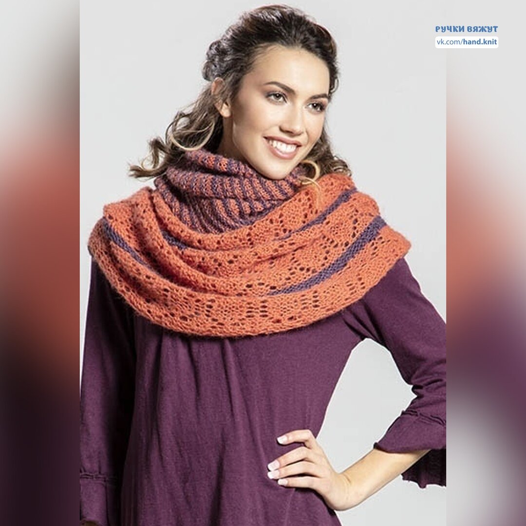 Плотность вязания: 16 петель и 28 рядов = 10х10 см полосатым узором на спицах 5 мм.