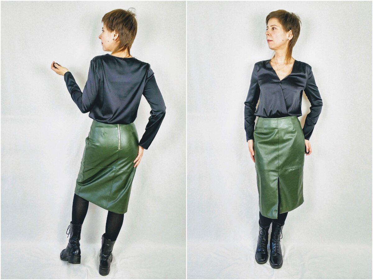 Блуза сшита из двух частей. Нижняя часть, которая трусы, бесшовная, тянучая, матовая и комфортная. Почти. Края ткани не обработаны, нитки не сыплются. Под юбкой или брюками "трусы" на попе не заметны. А вот спереди... Простите за подробности, но они будут. "Трусы" застёгиваются на три металлических кнопки. Держатся хорошо. Но чтобы эти кнопки присобачить к тонкой ткани, край несколько раз подвернули. Он стал грубым, толстым и торчащим. И вся эта конструкция приходится аккурат спереди между ног, как маленький ковш экскаватора. Я сделала эти фотки! Но не покажу. Стесняюсь.