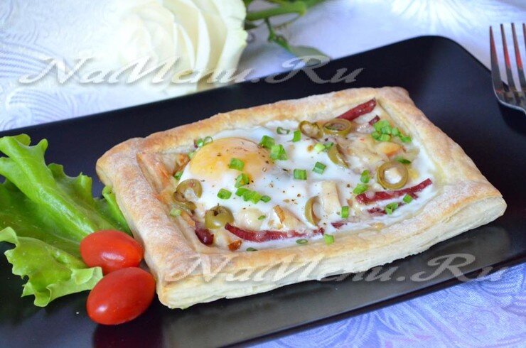 Вам понадобится: 🥠Тесто предварительно разморозить (при комнатной температуре 30 минут) 🥓Ветчину и колбасу нарезать кубиками небольшого размера. Оливки нарезать тонкими колечками 🧀Сыр натереть на терке 🔪Рабочую поверхность припорошить мукой. Скалкой немного раскатать пласт теста. Разрезать его на два квадрата или прямоугольника ✔️По периметру сделать отбортовку ножом с закруглённым концом (не прорезая насквозь), (от края 1-1,5 см.). Внутреннюю часть квадрата наколоть вилкой в нескольких местах 🥄Смазать квадрат майонезом, разложить начинку 🔥Противень застелить пергаментной бумагой, перенести на него заготовки. Выпекать в духовке 15 минут при 200 градусах, разбить в каждую яйцо и выпекать еще на 7-10 минут https://namenu.ru/7041/Slojki_s_vetchinoj_i_syrom_na_zavtrak/