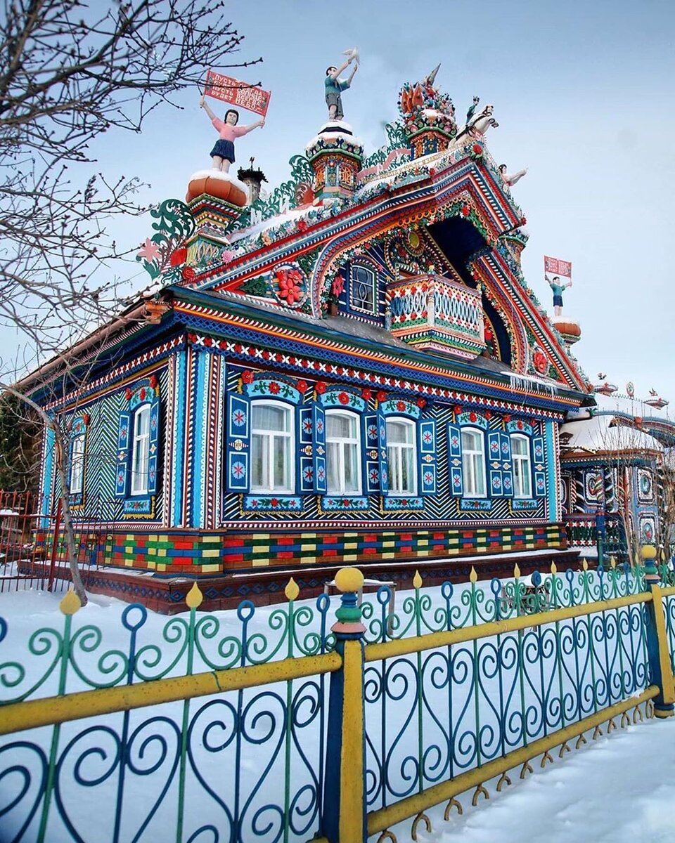 Этот сказочный дом никого не оставит равнодушным, кузнец Сергей Иванович Кириллов вложил в него частичку души, и даже про существование села "Кунара" вы бы наверное не узнали, если бы не его дом. Работу над домом Сергей Иванович начал в 1954 году, и совершенствовал его вплоть до своей смерти. Дом украшен различными вырезками из дерева и металла. Так же в украшении дома присутствуют советские лозунги , которые держат пионеры. Если приглядется, то можно заметить,что большая часть дома украшена цветами. Еще при жизни кузнеца, его дом был признан одним из самых красивых домов в России (1999 год). Умер Сергей Иванович в 2001 году, и оставил после себя такое "наследие". Жизнеспособность дома сейчас поддерживают волонтеры и близкие родственники кузнеца. Село Кунара находится в Свердловской области, в 20 километрах от Невьянска. Если вы будете проездом в этих местах, то советуем посетить данное место, и скорее всего вы будете не одни (не только жители с Урала приезжают посмотреть в живую на д