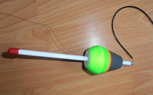 В него продеть пластмассовый цилиндрический поплавок, внизу которого, вставить и приклеить кольцо. Такую снасть бросают как возле берега, так и на дальнее расстояние, подходящая кормушка весом 10-60 гр.