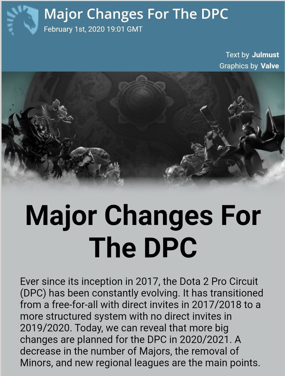 Представители именитых организаций на днях посетили Штаб-квартиру Valve. По заявлениям разных источников, компания всё же решила прислушаться к коммьюнити и изменить Компететив составляющую Dota 2. Изменения Майноров и Мейджоров После завершения текущего сезона (после TI10) майноры прекратят своё существование, так как не несут смысла как такового, а количество Мейджоров сократится с 5 до 3. На смену майнорам придут Региональные Лиги. Изначально лиги планируются проводить в онлайн режиме, а Valve будут принимать непосредственное участие в организации и контролем за лигами Региональные Лиги Будут являться аналогией квалификаций, то есть будут основным средством отбора на более крупные турниры (Мейджор-турниры). DPC очки так же останутся основной единицей получения инвайта на The International, а места в лиге и на Мейджоре будут напрямую влиять на их количество. Лига будет состоять из двух Тиров. Второй тир будет для новых команд, миксов и новых игроков в целом, более сильные команды бу