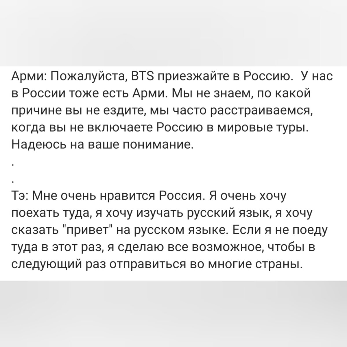 Русская арми написала комментарий на Weverse с просьбой BTS посетить Россию . На что Тэхен ответил , что очень хочет посетить Россию и выучить русский язык, хочет сказать "привет " на русском ! У Русских арми появилась надежда на то , что bts приедут с туром или , что хотя бы просто Тэхен посетит Россию!