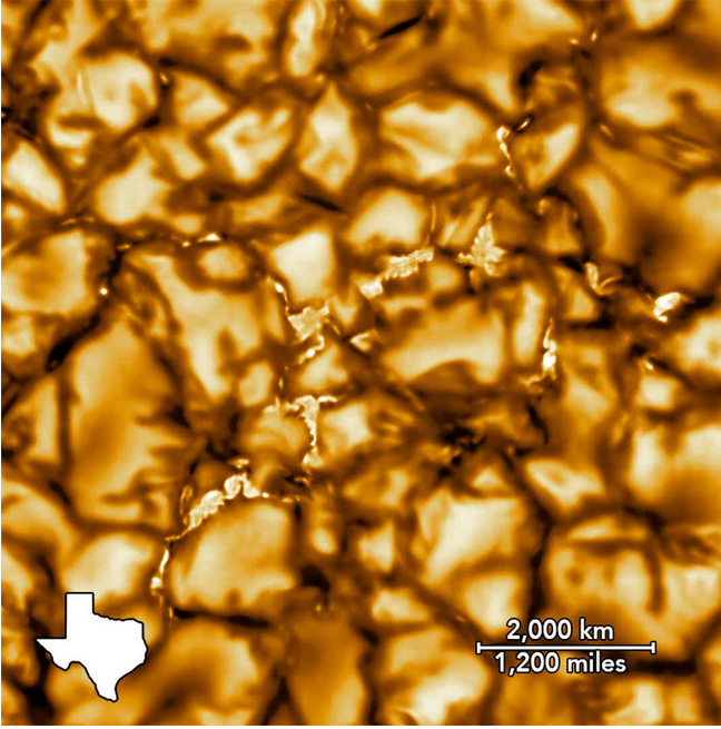 Одно из изображений показывает образец турбулентной "кипящей" плазмы, которая покрывает все солнце. Клетчатые структуры - каждая размером с Техас - являются признаком насильственных движений, которые переносят тепло изнутри Солнца на его поверхность.