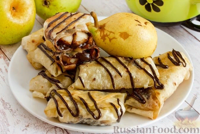 Лаваш - это не просто тонкая лепёшка, это ещё и универсальный продукт, из которого получаются отличные закуски, выпечка и другие блюда. Сегодня мы приготовим жареные конвертики из лаваша с начинкой из груши и шоколада. Хрустящий лаваш прекрасно сочетается с грушей, ну а дополняет этот тандем растопленный шоколад. Вкусно и оригинально! Продукты (на 2 порции) Лаваш тонкий - 1 шт. (130 г) Груша - 1 шт. (260 г) Шоколад - 90 г Сливки - 80 мл Сахарная пудра - 2 ч. ложки Масло сливочное - 30 г