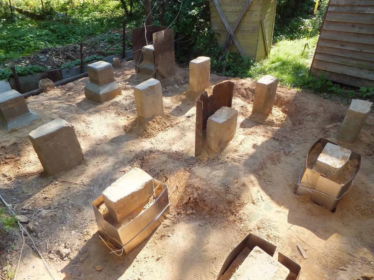Замечу, что выбранная для строительства сарая площадка, видимо, попала на край подземной реки. Половина ям оказались сухими, а половина тут же наполнились водой почти доверху. Вот те на... Я начал беспокоится за фундамент. Ведь он не соответствовал никаким шаблонам, и если бы он поплыл, все шишки полетели бы в меня!