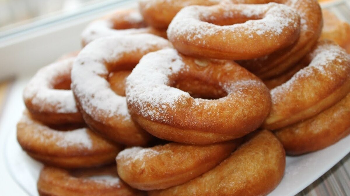 Готовые пончики выкладываем на бумажное полотенце для удаления лишнего жира. По желанию посыпаем пончики сахарной пудрой.