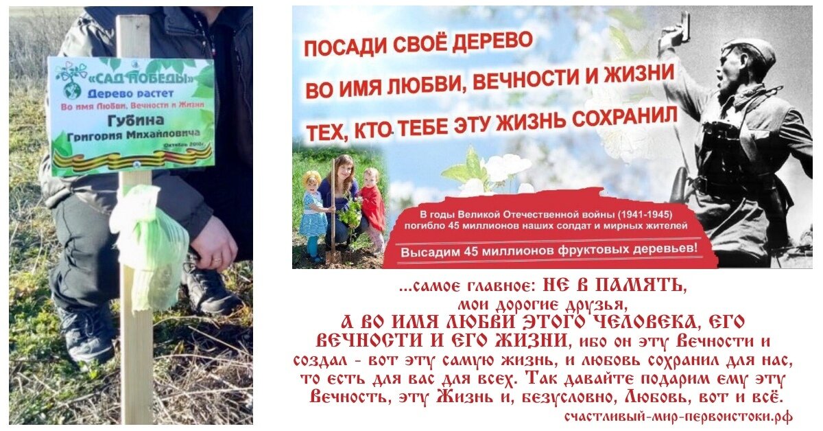 Ты держишь фотографию в руках, на которой изображён твой родственник, он защищал свою и твою Родину от кровожадного врага в 1941-1945 годах во время Великой Отечественной войны. Как хорошо, что ты помнишь это и не забываешь! Но ты можешь сделать больше. Посади дерево во имя Любви, Вечности и Жизни своего великого предка. Не для памяти, а именно для жизни.