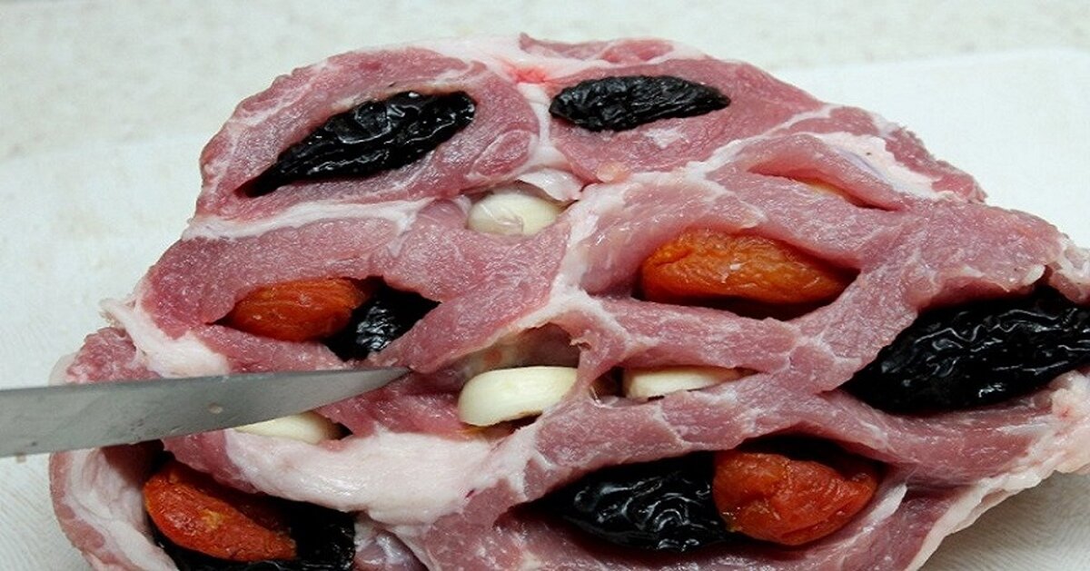 Сделайте в вырезке надрезы. Заполните их черносливом и сыром.