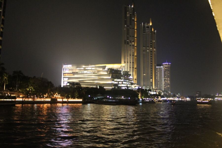 Посетили вечерний Бангкок. Это такая экскурсия, в разных вариациях предлагается в разных агенствах. Программа по описанию включает поездку в Бангкок и круиз на речном кораблике по речке Чао Прайя с шикарным ужином на борту. Нас и вечерний Бангкок отделяло расстояние и пробки на дорогах между Паттайей и столицей Тайланда. Забрали из отеля на Джомтьене в 14-30. Затем еще колесили по Паттайе минут 40, собирали полный автобус. К пристани прибыли лишь к 18-00, хотя в пробках особо не стояли. По пути в пригородах Бангкока нагляделись на заводы мировых и тайских гигантов, а также на местные трущебы. Они весьма обширны, доложу я вам. Не удивительно, считается, что население города (без туристов) около 14 миллионов человек. Из них очень много приезжих из соседних бедных стран, как Лаос и Камбоджа. Люди едут устраниваться на промышленные предприятия, а на хорошее жилье у них денег нет. Гид объясняет, что туризм стоит лишь на 5 месте в экономике Тайланда, на первом - сельское хозяйство и промы