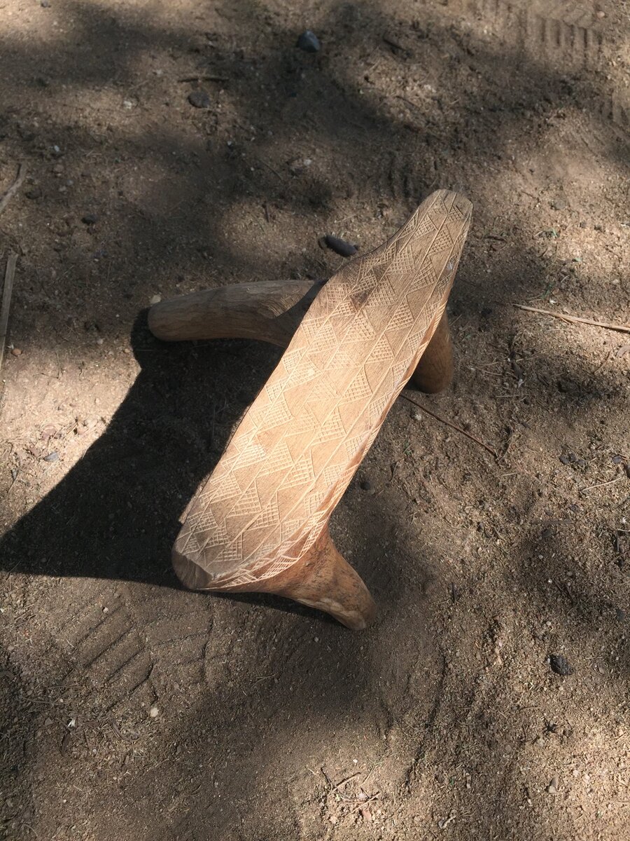 На на юго-западе Эфиопии в долине реки Омо часто можно увидеть идущих куда-то людей со странным предметом в руках. Вот таким. Или такими. Мы такие видели в этнографическом музее в Аддис-Абебе и полагали, что это подголовники. В Африке некоторые причёски настолько сложные, что требуют особого расположения ночью. Причём по форме подголовники отличаются от региона к региону. Однако днём их используют несколько иначе. Вот, наш охранник присел. Причём используют эти сидушки-подставки мужчины из самых разных племён народов юга в Эфиопии. Это, например, хамер. Удивительно, но я ни разу не видела, чтобы на них сидели женщины. Женщины обычно садятся прямо на землю, вытянув ноги перед собой, как женщины из племени мурси на фото ниже. Кстати, не самая удобная поза с непривычки. Или используют подручные средства, как дамы на этом рынке. Про запрет использовать эту сидушку женщинам я нигде не встречала информации. Может, он им просто без надобности. Мы себе тоже такую прикупили в качестве сувени