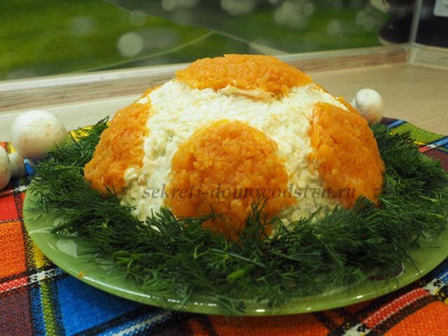 Красивый и вкусный салат "Футбольный мяч на траве" приготовим на 23 февраля для сильной половины нашего общества. Великолепный, щедрый, необычный и удивительный... Совсем, как наши любимые мужчины! Салат "Футбольный мяч на траве" Дорогие мужчины этот салат для вас! 1. Печень помыть, почистить и порезать небольшими пластинами. Вначале обжарить ее на одной стороне, чтобы она побелела и слегка прихватилась, затем с другой. Таким образом мы запечатаем весь сок внутри и печень будет очень сочной и нежной. Потом потомить ее под крышкой на небольшом огне до готовности. В случае надобности подлить водичку. За 5 минут до окончания жарки посолить и поперчить. 2. На второй сковороде обжарить лук кубиками и морковь, тертую на крупной терке. Жарить до готовности, или пока морковь не станет мягкой. Не забыть посолить и всыпать немного перца. При желании все это можно обжарить вместе. Но салат в таком случае получится более темным. 3. Грибы порезать сантиметровыми кубиками и обжарить на небольшом