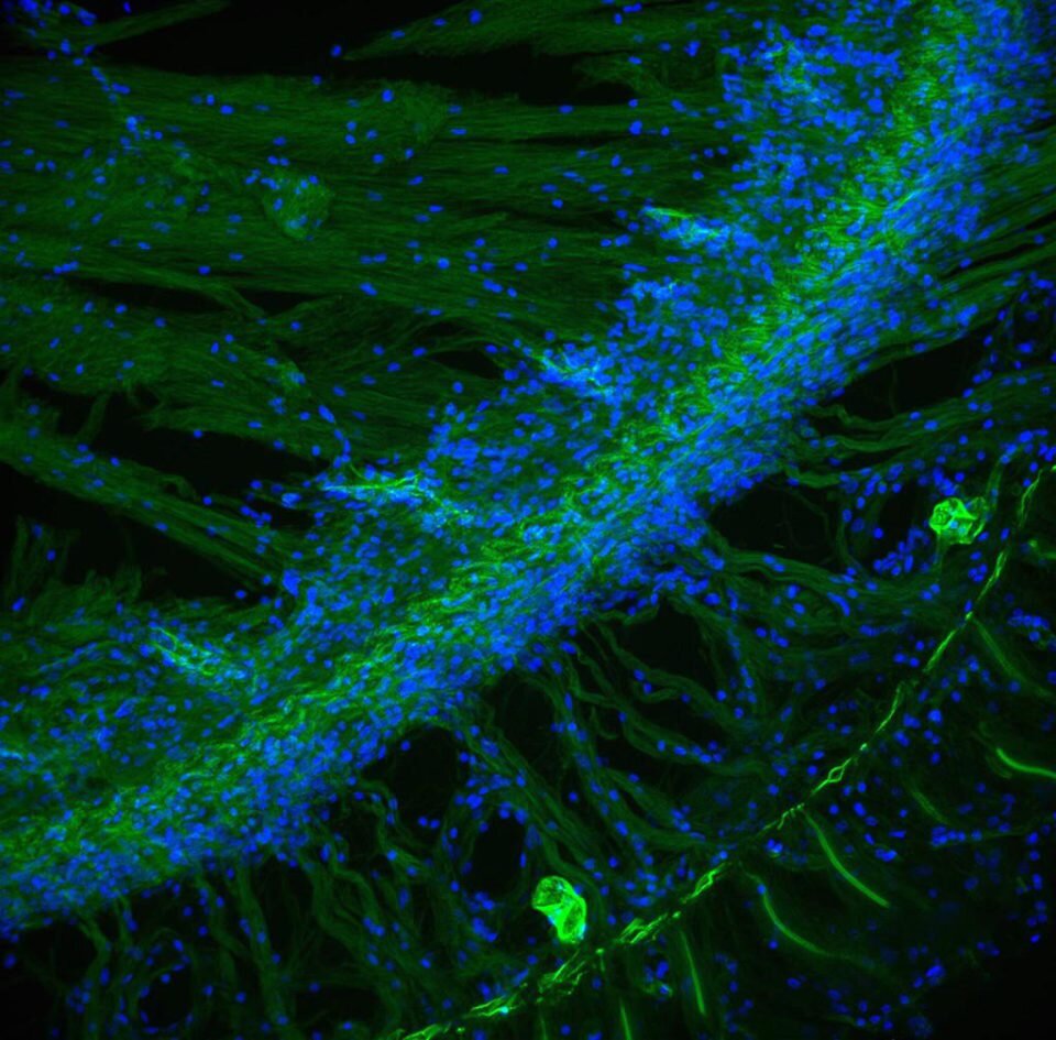 Перед вами — зрительная система рака-богомола. У раков-богомолов одна из самых сложных зрительных систем из когда-либо изученных. Если у людей три типа цветочувствительных колбочек в глазах, то у раков-богомолов их 16. В правом нижнем углу снимка — сетчатка, откуда сигнал передается на первую оптическую долю. Затем униполярные нейроны (что это такое, можно прочитать в нашем специальном материале, посвящённом клеткам нервной системы), показанные синими точками, передают информацию в следующую оптическую долю. Таким образом, если у человека значительная часть обработки изображения происходит в мозге, то у раков-богомолов, для ускорения, обработка происходит по пути в мозг. Илл: ZEISS MicroscopyЧитайте материалы нашего сайта в Facebook, ВКонтакте и канале в Telegram, а также следите за новыми картинками дня в Instagram.