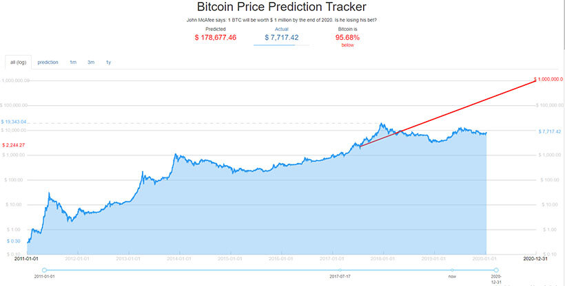 Логарифмическая шкала цены создает определенную иллюзию, но биткоину нужно вырасти почти в 20 раз, чтобы сбылось пророчество Макафи.