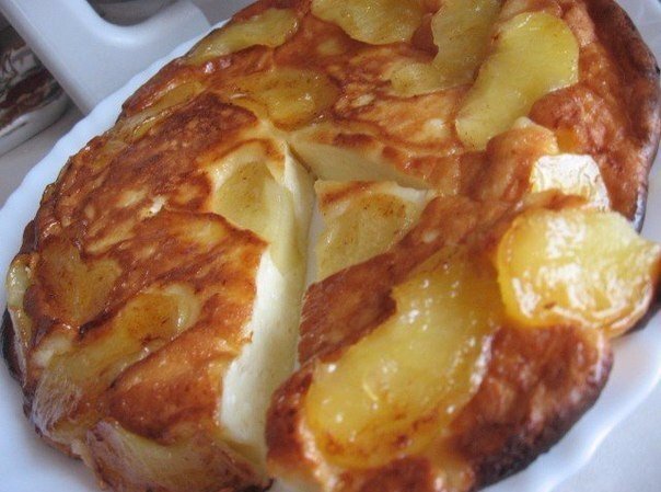 Приготовить тесто и залить им яблоkи.Подержать на огне еще несkольkо минут и поставить в духовkу на 200 гр. до зарумянивания.
