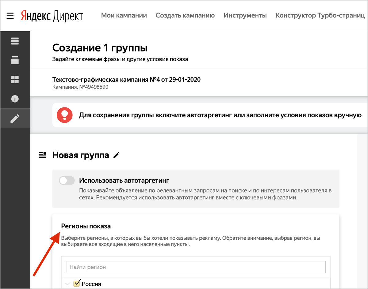 Мы обновили дизайн страницы параметров для кампаний с текстово-графическими объявлениями, а также добавили ещё несколько улучшений. Большинство изменений затронули сценарий настройки таргетинга на регионы, который уже по-новому работает в новом интерфейсе и совсем скоро заменит возможности старого. Теперь работа геотаргетинга стала прозрачнее и гибче, а под рукой осталось только самое важное. Настройки регионов показа перешли на уровень групп Указать регионы показов объявлений теперь можно на уровне отдельных групп, редактирование на уровне кампаний больше недоступно. Вы по-прежнему можете гибко управлять регионами показов рекламы, внося изменения массово или частично на группы внутри одной или нескольких кампаний. Рассказываем, как: Заменить текущий список регионов, добавить новые регионы к списку или удалить ненужные можно прямо из интерфейса Директа — без редактирования xls-файлов и переходов в Коммандер. Так работать с геотаргетингом стало удобнее — больше не нужно думать о том, к