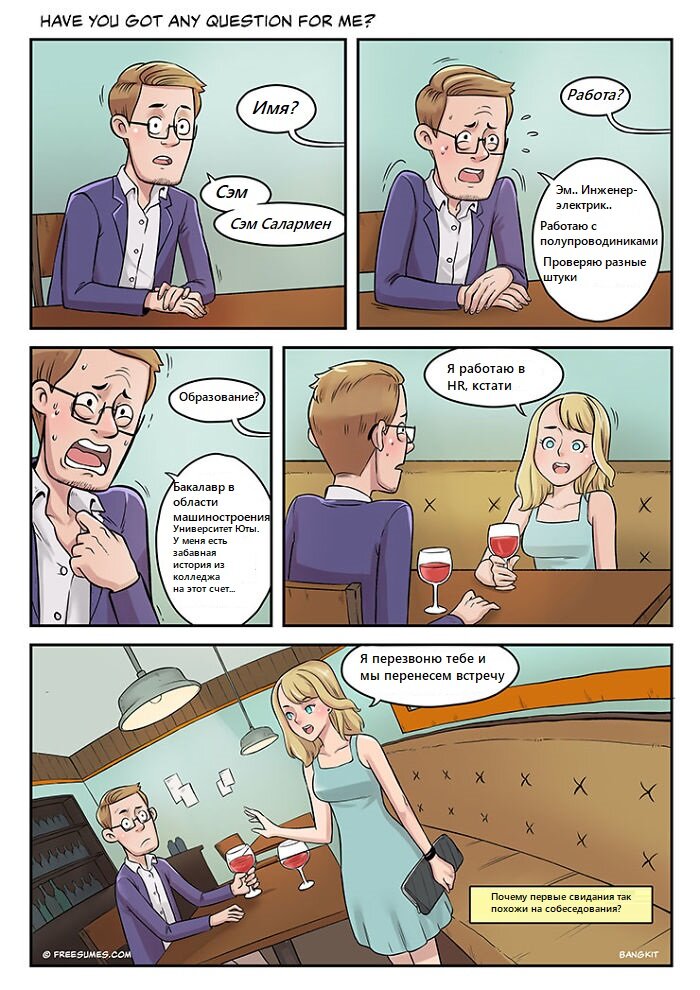 Всем привет! Надеюсь, ваши выходные прошли также насыщенно, как мои! Понедельник - день тяжелый, а значит пора получить порцию хорошего настроения и прочитать свеженький перевод комиксов. Я все еще пробую себя в форматировании изображений, поэтому ваша критика будет как нельзя кстати. Сегодня мы поговорим о реалиях поиска работы и о том как не провалить собеседование в желанную компанию! Не забудьте подписаться на мой канал и поставить лайк этому посту! За репост в соцсети буду безмерно благодарна :) И да, 4 не потому, что не было лень переводить. Просто эти, на мой взгляд, были самыми интересными ;) Автор комиксов: Freesumes