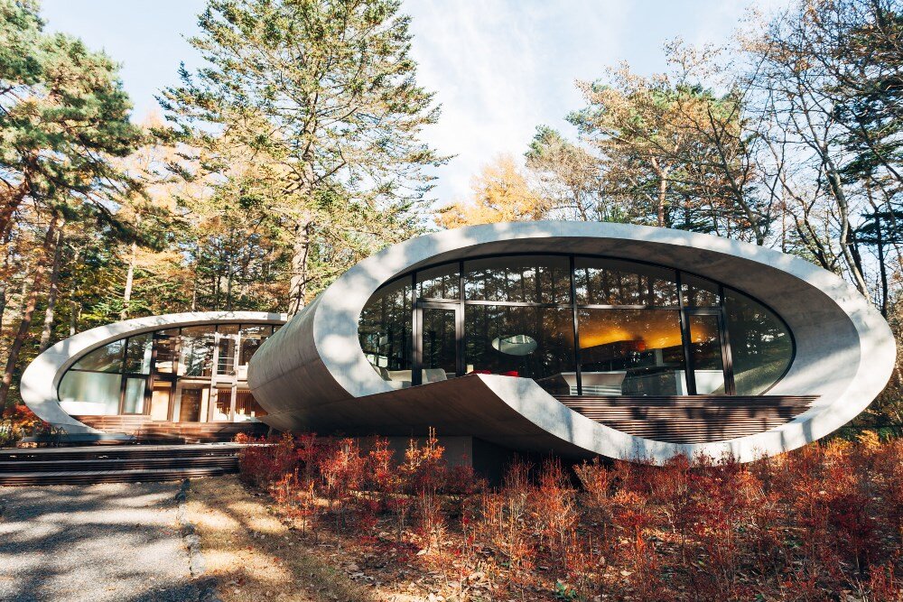 Фантастический дом «Shell residence» расположен в живописной японской префектуре Нагано. По своей форме он напоминает раковину огромного моллюска, затерявшуюся в нетипичной для себя стихии – реликтовом смешанном лесу Каруизава. Проект необычной виллы был разработан архитектором Котаро Иде из компании «ARTechnic», и реализован за 18 месяцев – строительные и отделочные работы были завершены в 2008 году. Несмотря на свою сказочную внешность, дом отлично адаптирован к суровым местным климатическим условиям. Он построен из пористого бетона, который в отличие от кирпича и дерева не разрушается под действием влажного воздуха и низких температур. Двойные стеклопакеты, специальные пропитки и внутренняя изоляция стен обеспечивает высокую теплоэффективность дома – он сохраняет внутреннюю температуру, подобно термосу. Дизайн здания одновременно простой и сложный. Мягкая пластичность линий формирует мощный 3D объем, с каждого ракурса дом выглядит по-разному. В архитектуре дома читается традиционный