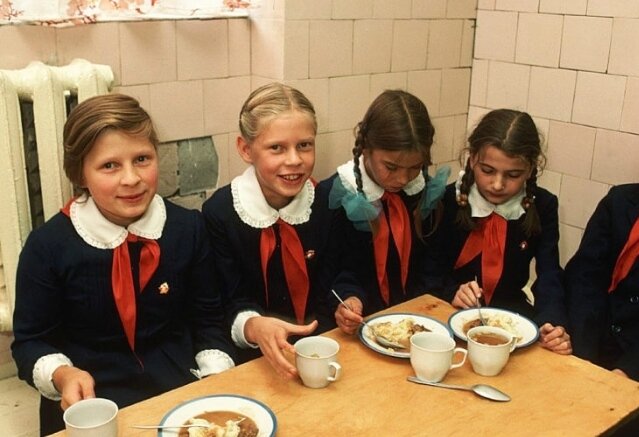 Столовая в советской школе: еда не тронута, девочки-брюнетки без энтузиазма смотрят в тарелки, обстановка убогая – отбитая плитка на стенах, грязные углы, скамейки сбиты наспех из досок, стол – трухлявое ДСП. От себя могу добавить, что батареи в советских школах красились такой плохой краской, что она никогда полностью не высыхала и при больших температурах начинала вонять. Любая ведомственная столовая в СССР, кроме номенклатурных, была пищевым комбинатом, производящим человеческий комбикорм очень низкого качества, так что питаться им можно было лишь по большой нужде или из-под палки. В СССР, действительно, не хватало нормальной еды. Голодать – не голодали, но огромная часть жизненных сил тратилась на непрерывные попытки достать, поймать и выждать в очередях что-нибудь приличное из съестного.