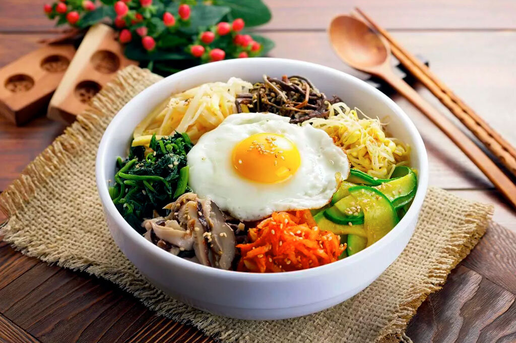 Самое яркое и узнаваемое блюдо корейской кухни. В состав этого простого кушанья обычно входят рис, различные тонко нарезанные овощи. Овощи не жарят и не тушат, а подают свежими. Ингредиенты: Как приготовить: 1) Отвариваем ½ стакана риса, предварительно его промыв, солим в конце приготовления. Готовый рис слегка обжариваем на кунжутном масле. 2) Тофу нарезаем пластинками. Смешиваем 50 мл соевого соуса и 25 мл столового уксуса и маринуем тофу. Даём постоять 10 минут, затем сливаем и обжариваем на растительном масле. 3) Огурец и морковь нарезаем тонкой длинной соломкой. Раскладываем по мискам морковь, огурец и соевые проростки, слегка солим и заправляем кунжутным маслом. 4) Яйцо зажариваем до состояния яичницы-глазуньи. 5) Приготовим соус. Запариваем молотый чили 2 ст. л. кипятка, добавляем 2 ст. л. соевого соуса, 1 ч. л. уксуса, 1 ст. л. кунжутное масло, сахар, чеснок и пробиваем блендером. 6) На дно миски выкладываем рис, сверху отдельными горками выкладываем тофу, соевые ростки