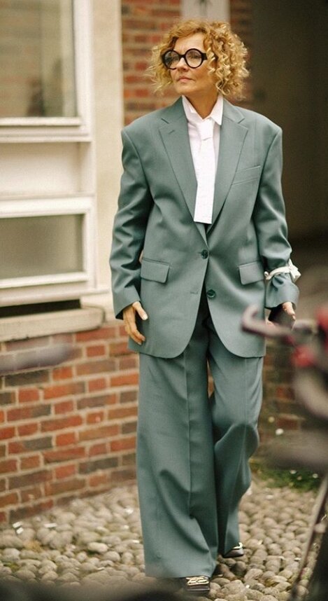 Брючный костюм вернулся в моду в новом воплощении: с удлиненными брюками-палаццо, однотонный и на пару размеров больше необходимого.