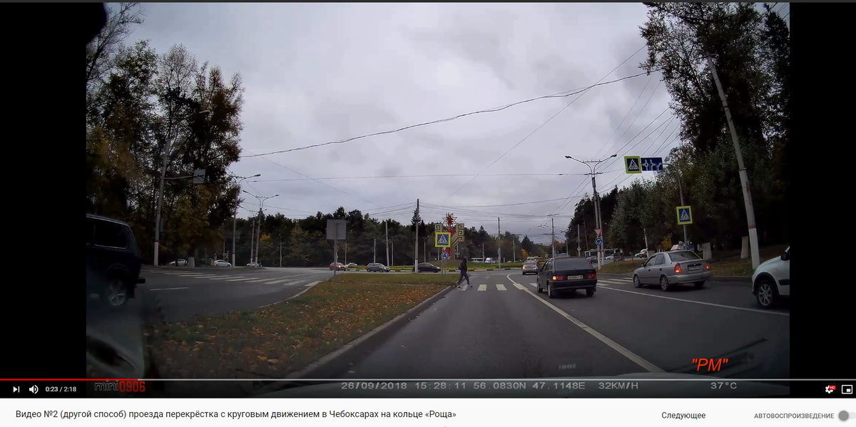 Видео №2 (другой способ) проезда перекрёстка с круговым движением в Чебоксарах на кольце «Роща»