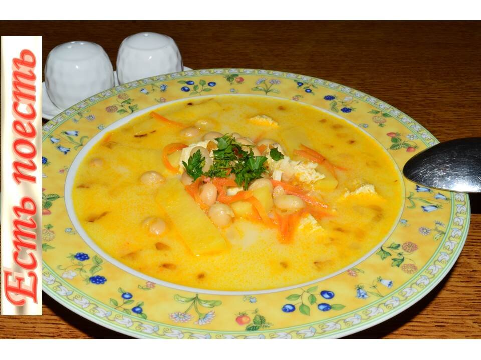 Отправить в бульон порезанный брусочками картофель, консервированную фасоль (жидкость предварительно слить), обжаренные лук с морковью, резанное мясо и сырок, порезанный на кубики.