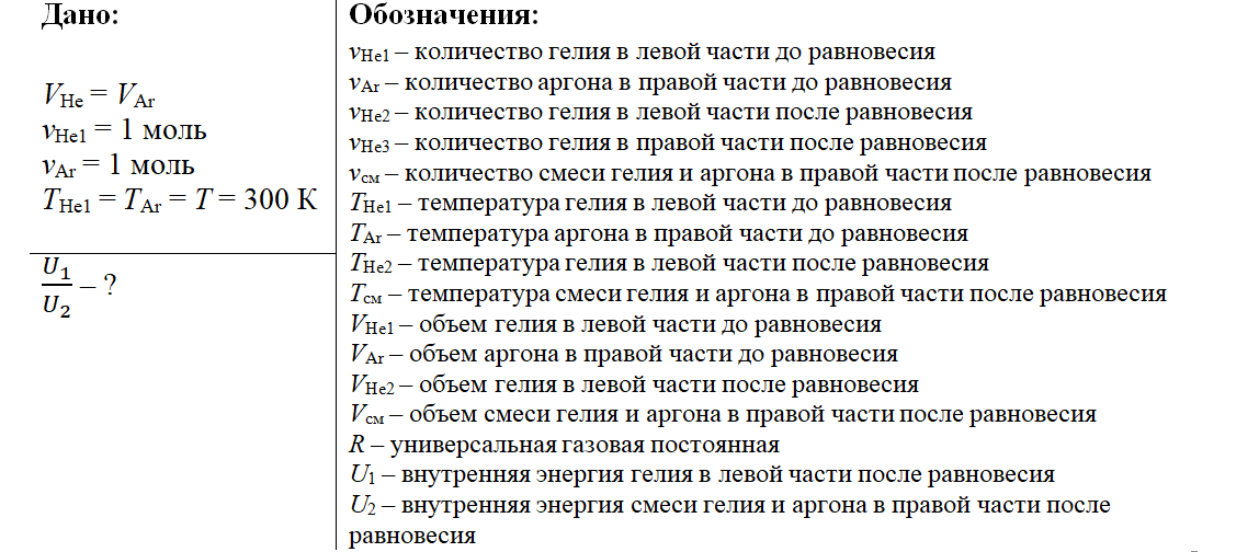 Теплоизолированный горизонтальный сосуд разделен пористой перегородкой на две равные части. В начальный момент в левой части сосуда находится 2 моль гелия, а в правой – такое же количество моль аргона. Атомы гелия могут проникать через перегородку, а для атомов аргона перегородка непроницаема. Температура гелия равна температуре аргона: 300 К. Определите отношение внутренних энергий газов по разные стороны перегородки после установления термодинамического равновесия.