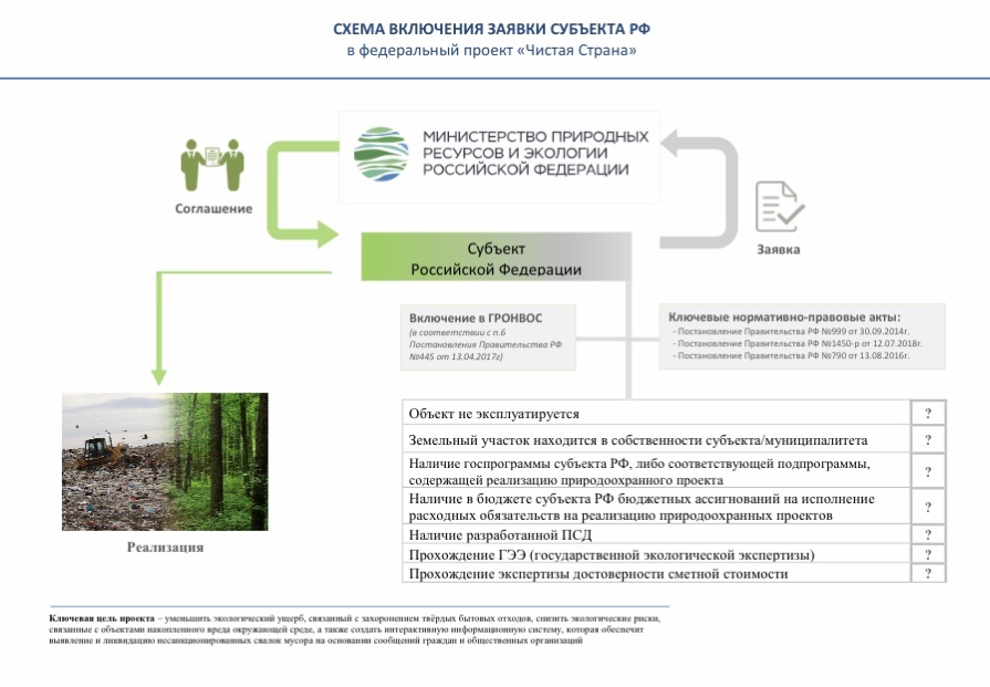 Для того, чтобы заявка субъекта РФ была включена в федеральный проект «Чистая страна», субъект должен подходить по следующим пунктам: -объект не должен эксплуатироваться -земельный участок должен находится в собственности субъекта/муниципалитета -иметь в наличии госпрограммы субъекта РФ, либо соответствующей подпрограммы, содержащей реализацию природоохранного проекта -иметь в бюджете субъекта РФ бюджетных ассигнований на исполнение расходных обязательств на реализацию природоохранных проектов -иметь в наличии разработанный ПСД -пройти ГЭЭ (государственная экологическая экспертиза) -пройти экспертизу достоверности сметной стоимости Далее субъект включается в ГРОНВОС и выделяется субсидия в соответствии со следующими нормативными актами: -Постановление правительства РФ 999 от 30.09.2014г. -Постановление правительства РФ 1450-р от 12.07.2018г. -Постановление правительства РФ 790 от 13.08.2016г. После этого заявка субъекта Российской Федерации отправляется в Министерство природных р