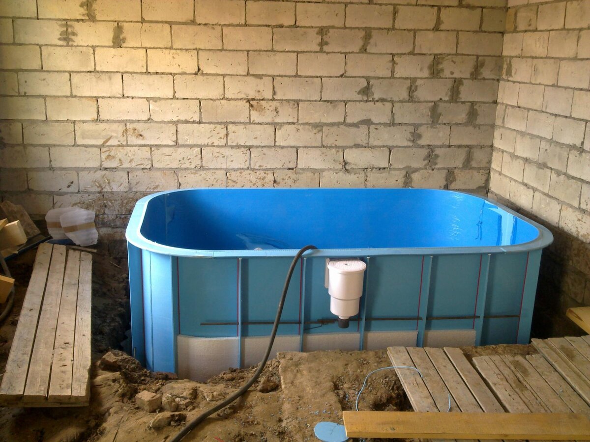 Виды бассейнов Бассейны, которые дополняют банные комплексы, бывают двух видов: Открытый тип бассейна нуждается в навесе, который защитит от попадания в воду мусора, пыли и инородных предметов. Для сооружения облегченного навеса используется оргстекло. Конструкция может иметь дугообразную или сферическую форму. Закрытый бассейн не нуждается в дополнительной защите, поскольку находится в помещении. Выделяют два варианта размещения закрытого бассейна: под одной крышей с баней или в виде отдельной постройки. По форме бассейны бывают квадратными, круглыми или фигурными (в соответствии с пожеланиями заказчика). Самым практичным вариантом является круглый бассейн, поскольку его легче всего очищать от скапливающейся грязи. Этапы строительства бассейна Первый шаг закладки бассейна – проектирование канализационной системы. Канализационная труба укладывается с умеренным уклоном по направлению к дренажной яме. Расстояние между дренажной ямой и зданием должно составлять не менее 5 метров. Т
