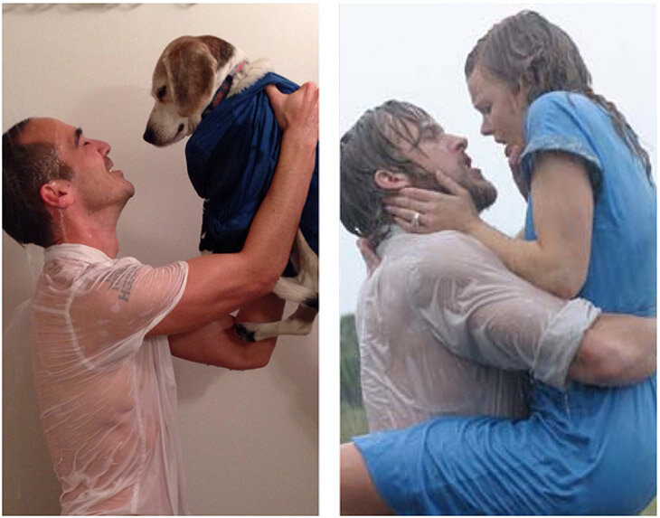 Реддитор по имени Крис Накка воссоздал самые известные романтические сцены фильма со своей чемпионской собакой Ригли. Эта творческая идея пришла в голову Крису, когда его коллеги предложили воссоздать сцену Титаника. Это было только начало, после этого он ежедневно снимал целую серию романтических фильмов во время обеда. Тетрадь (2004) Горбатая гора (2005) Грязные танцы (1987) Человек-паук (2002) Выпускник (1967) Шестнадцать свечей (1984) Призрак (1990) Голодные игры (2012) Top Gun (1986) Титаник (1997) Райан Гослинг (1980)